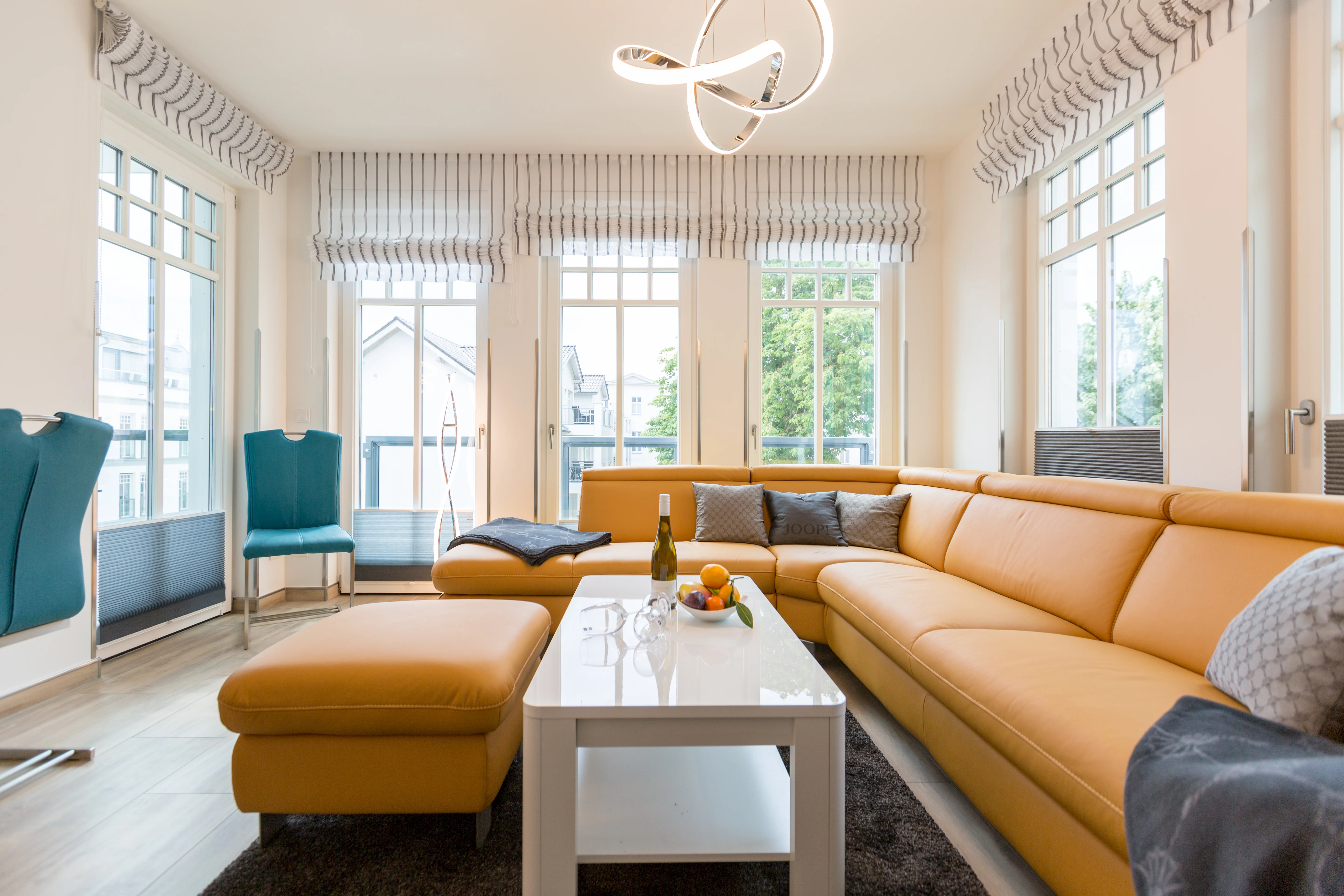 - Große Panoramafenster mit Außenrollos gegen Sonneneinstrahlung